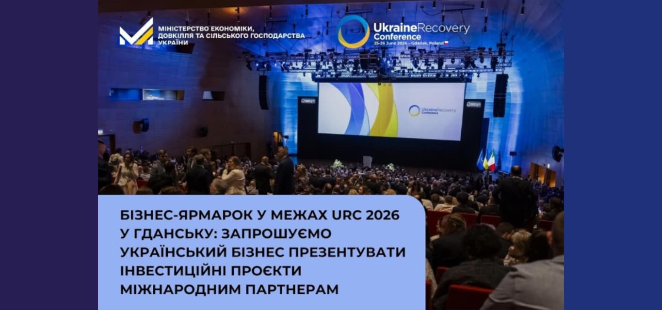 Мінекономіки запрошує українські приватні компанії — малі, середні та великі — взяти участь у Бізнес-ярмарку в межах Конференції з відновлення України 2026 (URC 2026). Захід відбудеться 25-26 червня 2026 року в польському місті Гданськ та проходитиме паралельно з основною програмою Конференції на тій самій локації, в окремій залі.