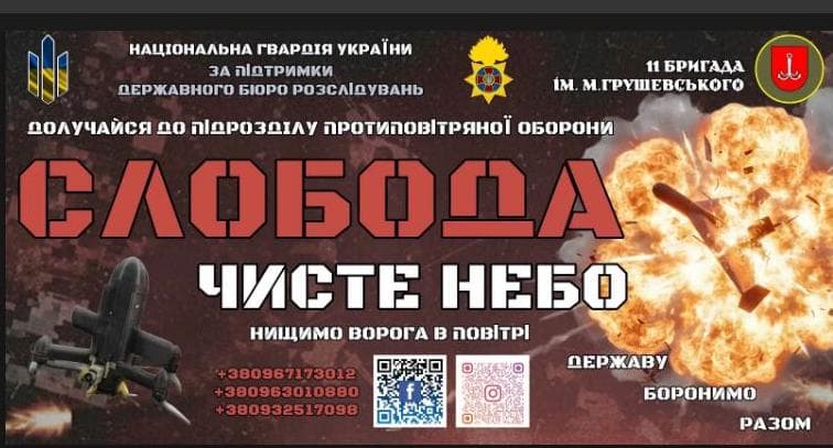 Ти захищатимеш свій дім. Твоя робота – це врятовані життя рідних, друзів, знайомих. Кожна збита ціль – це врятований будинок чи стратегічний об’єкт. Сучасна зброя та фахове навчання. Ми навчимо тебе володіти технікою, яка ефективно нищить повітряні загрози. Досвідчені інструктори зроблять з тебе профі. Потужне братерство. ППО – це командна робота. Ми – єдиний організм, де кожен довіряє кожному. Честь нести службу в 11-ій бригаді. Стань частиною підрозділу ППО! Південь – це фортеця. Ми – її щит. Не чекай на повістку. Приходь добровільно. Обери шлях воїна, який дарує безпеку небу. Тел. +38 (096) 717-30-12, +38 (067) 835-51-43